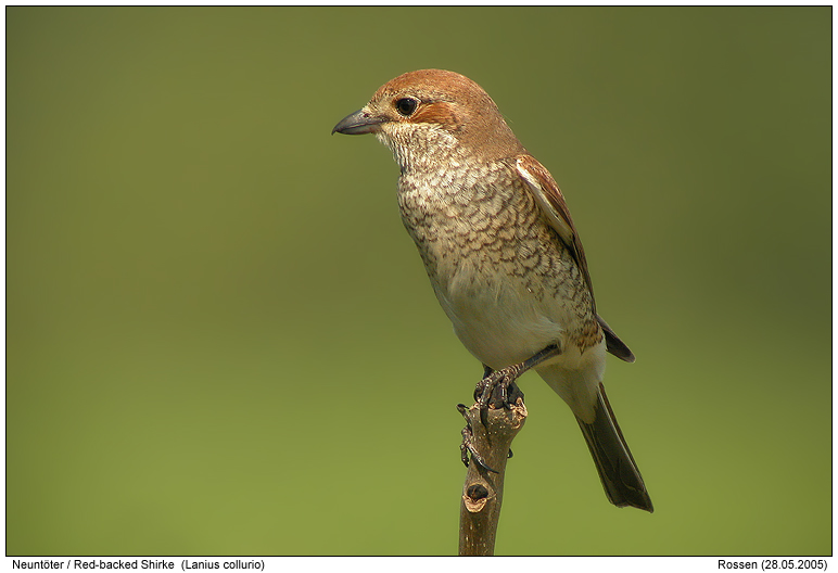 Würger (Laniidae) Typische Merkmale : Das Neuntöter - Männchen ist recht auffällig gefärbt. Es hat einen stark ausgeprägten, dicken schwarzen Augennstreif, einen grauen Kopf und einen leuchtend braunen Rücken.Das Neuntöter - Weibchen ist weitaus unauffälliger gefärbt, und hat einen wellenförmige Querzeichnung auf der Brust.Der Schnabel der Neuntöter ist vorne leicht hakenförmig gebogen.Der Neuntöter wird 16 bis 18 cm gross.Verhalten : Oft kann man den Neuntöter auf einer exponierten Warte sitzend auf der Jagd sehen. Er ist ein Ansitzjäger, und fliegt blitzschnell von seinem Jagdansitz auf, wenn er Beute erspäht hat.Manchmal kann man den Neuntöter auch dabei beobachten, wie er Hecken entlangfliegt und kurz ähnlich wie ein Turmfalke im Rüttelflug stehenbleibt, um dann im richtigen Moment Beute zu machen.Bei Nahrungsüberschuss spiesst der Neuntöter seine Beute auf Spitzen Ästen oder Dornen auf.Nahrung : Der Neuntöter ernährt sich hauptsächlich von grösseren Insekten, Eidechsen, Jungvögel und kleinen Mäusen.