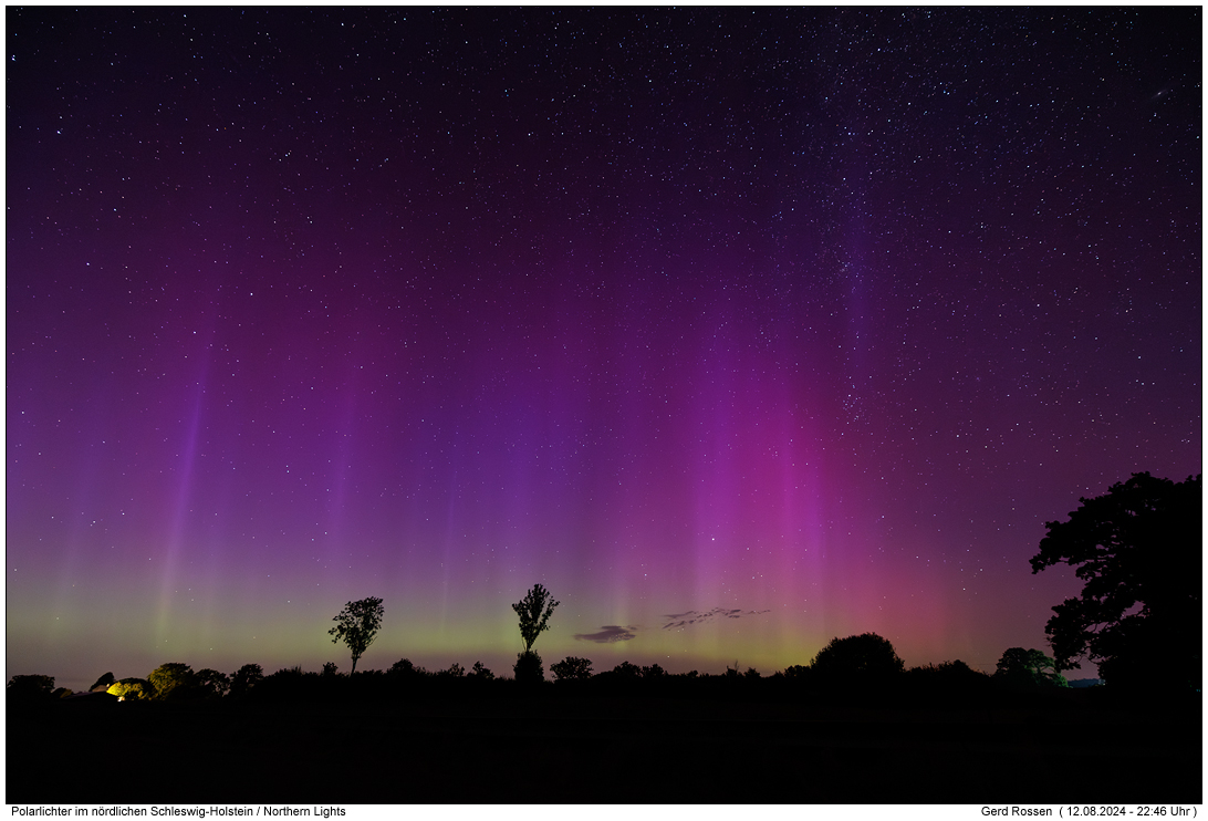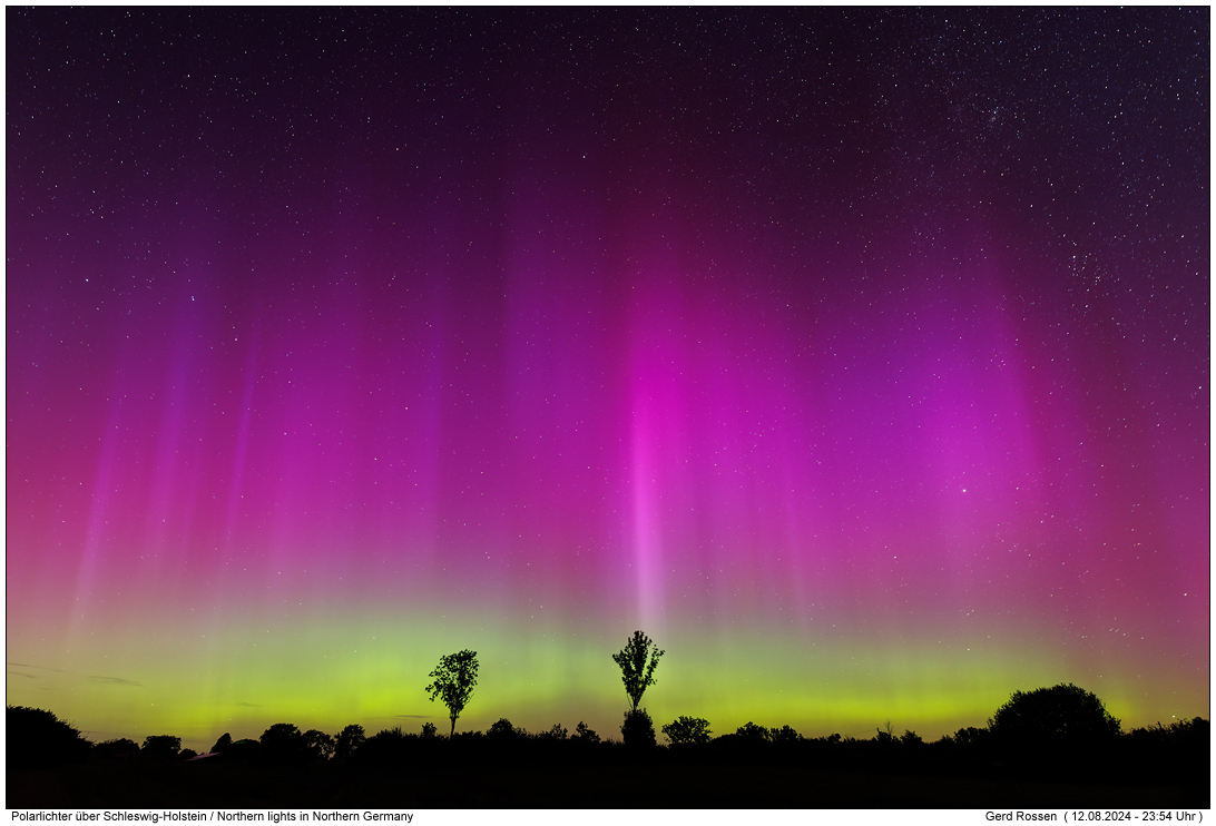 Polarlicht in Norddeutschland Schleswig-HolsteinBeeindruckende Polarlichter . . zeigten sich am Abend des 12.08.2024 am Himmel über Deutschland. Diese Aufnahme entstand ganz im Norden Deutschlands bei Flarup, in der Nähe von Flensburg und Süderbrarup. Also direkt vor meiner Haustür. Bereits am 10.05.2024 waren hier starke Polarlichter zu beobachten.Fotograf : Gerd Rossen Verwendete Kamera : Canon EOS R5 + Canon RF 15-35mm 2,8 L IS USM Polarlichter-Foto enthält zusätzlich : Norrsken 2024 |