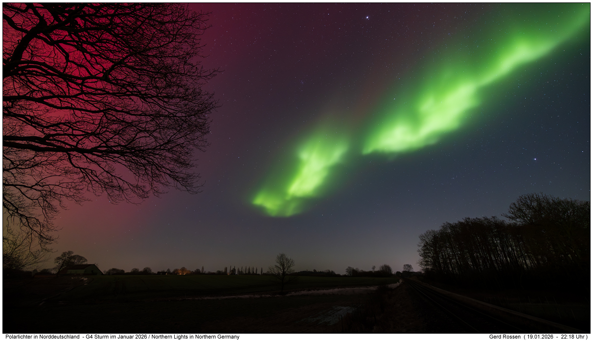 Polarlichter in Deutschland im Januar 2026Ein G4 Sonnensturm . erreichte uns am frühen Abend des 19.01.2026. Es reichte für fotografische Polarlichter bis in Aquatornähe. In Deutschland waren die Lichter mit bloßem Auge gut sichtbar, teilweise sogar leuchtend grün, so wie man es eigentlich nur aus dem Norden Skandinaviens kennt.Fotograf : Gerd Rossen Verwendete Kamera : Canon EOS R5 + Canon RF 15-35mm 2,8 L IS USM |