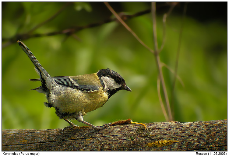 Ein FestmahlEine haarige Raupe hat sich diese Kohlmeise erbeutet. Eigentlich war ich der Meinung, dass nur der Kuckuck die stark beeharten Raupen frisst. Aber das Foto beweist das Gegenteil Fotograf : Gerd Rossen Verwendete Kamera : Nikon Coolpix 5000 + Eigenbau Digiscoping-Adapter + Swarovski ST80HD + Zoom-Okular 20-60x (Digiskopie) |