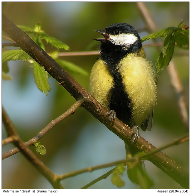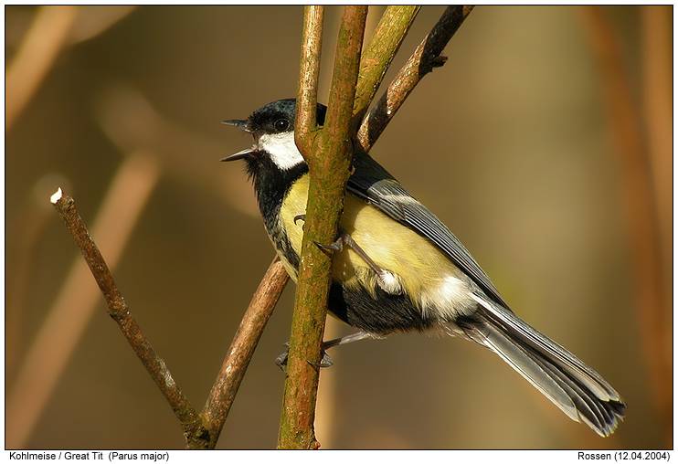 KohlmeiseRevierabgrenzung Im Frühjahr ist in der Natur fast aus allen Büschen ein Vogelgesang zu hören. Auch die Kohlmeise will mit Ihrem Gesang sagen : Stop, dieses Revier ist bereits besetzt. Fotograf : Gerd Rossen Verwendete Kamera : Nikon Coolpix + Eigenbau Digiscoping-Adapter + Swarovski ST80HD + Zoom-Okular 20-60x (Digiskopie) |