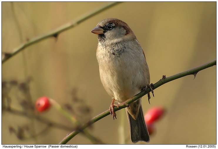 In den HagebuttenIn den Hagebutten halten sich gerne unsere Haussperlinge auf. Dort scheinen sie sich wohl sicher und geschützt vor Feinden zu fühlen.Fotograf : Gerd Rossen Verwendete Kamera : Nikon Coolpix 5000 + Eigenbau Digiscoping-Adapter + Swarovski ST80HD + Zoom-Okular 20-60x (Digiskopie) Was ist noch zu sehen auf dem Haussperlinge-Bild : Flarupgaard |
